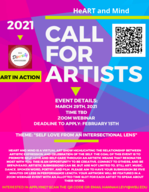HeArt and Mind is an art show highlighting the relationship between artistic expression and celebration of the self. The goal of this event is to promote self-love and self-care through an artistic means that resonates most with you. This is an opportunity to be creative, connect to others, and be seen/heard. Artistic submissions can be, but are not limited to, still art, music, dance, spoken word, poetry, and film. Please aim to have your submission be five minutes or less in performance length.