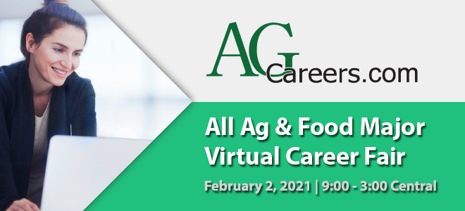 AGCareers.com is hosting a Virtual Career Fair for Ag and Food majors. The purpose of this event is to connect students with employers and the event is open to all university and college students. Learn more & register: https://www.careereco.com/Fair/EventDetails?fairId=13c58da1-e33f-4d43-925f-ac70015fbf63
