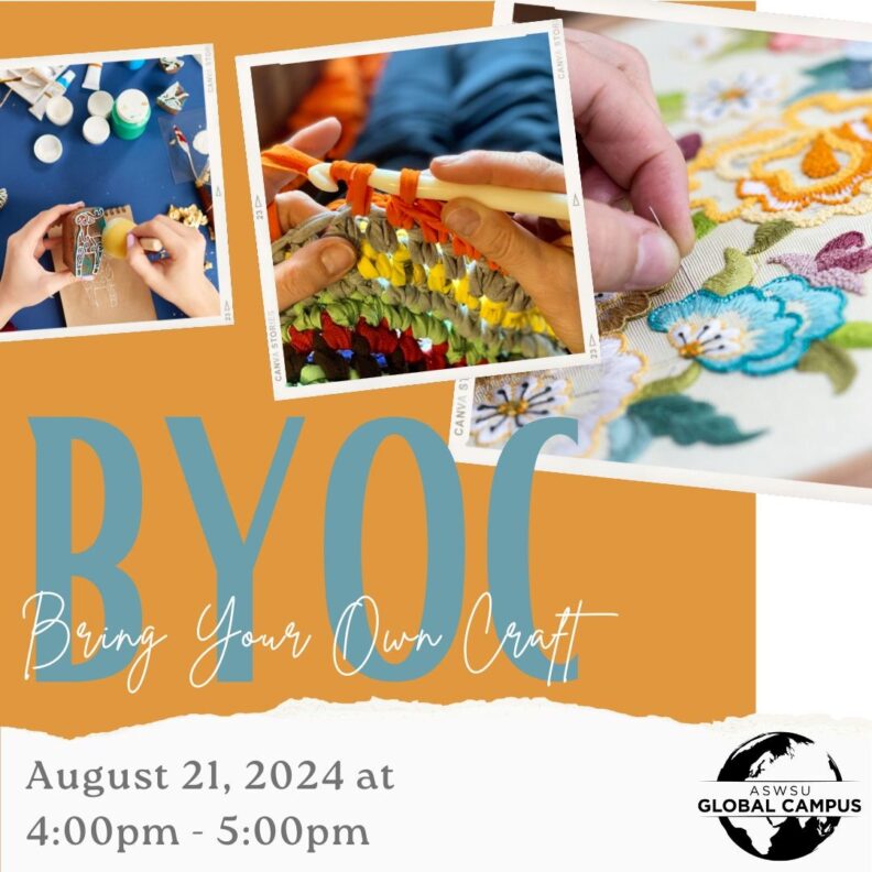 It’s a BYOC- Bring Your Own Craft! Hang out with other students and share what you’re working on! Be it writing, drawing, sewing, scrapbooking, and whatever else, we’d love to see what you’re passionate about! Ten lucky participants will win some Coug Swag.