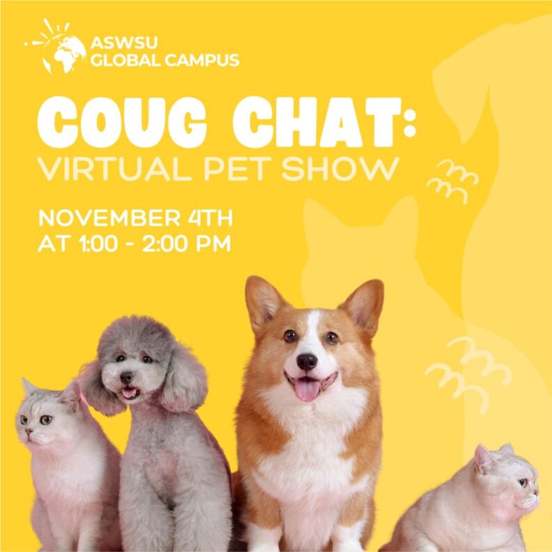 Do you have fur babies that you want to show off to fellow Global Cougs? Do they love dressing up and being on camera? Come on over and join us for ASWSUG office hour on Coug Chat. Put your pets on camera in their best costumes. Share exciting facts about them and your fondest memories of them. This is open to ALL WSU students, alumni, faculty, and staff. ONLY the S & A fee-paying global student-participants will receive pet bandanas. Wait, there’s more! Three (3) best-dressed pets will also receive surprises. Don’t miss out on this fun and exciting event filled with cuteness overload!