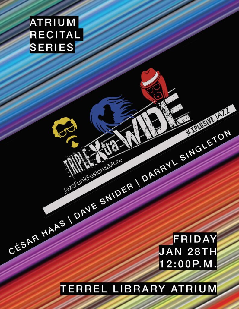 Triple Xtra Wide is a trio that plays what they call “expanded jazz.” You will hear virtuosic and at times mind-bending arrangements of jazz, funk, rock, and more! César Haas, Dave Snider, and Darryl “Doc D” Singleton have a century of combined playing experience. Don’t miss it!