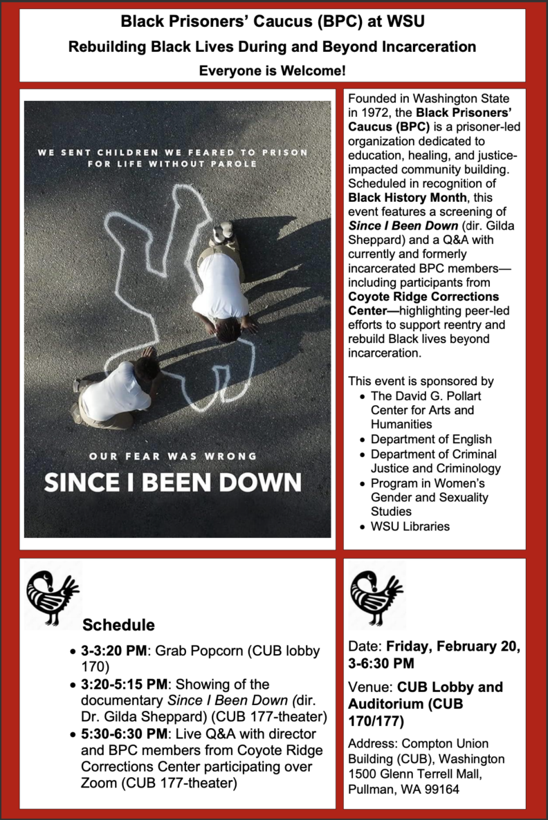 Founded in Washington State in 1972, the Black Prisoners’ Caucus (BPC) is a prisoner-led organization dedicated to education, healing, and justice-impacted community building. Scheduled in recognition of Black History Month, this event features a screening of Since I Been Down and a Q&A with currently and formerly incarcerated BPC members—including participants from Coyote Ridge Corrections Center—spotlighting peer-led efforts to support reentry and rebuild Black lives beyond incarceration.