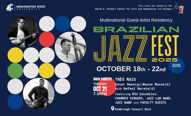 The 5-day festival will focus on performances, clinics, rehearsals, and talks that promote dissemination, teaching, and learning of Brazilian music at WSU and local schools. The internationally acclaimed guest artists will be working closely with local middle and high school students, and also WSU Pullman students and faculty on performances and clinics that involve several areas and ensembles from the School of Music, including the WSU Jazz Big Band, the Jazz Lab Band, WSU Chamber Singers, Jazz Northwest (WSU Jazz Faculty Ensemble), and a combined student and faculty chamber ensemble. All concerts and clinics are free of charge and open to the public!