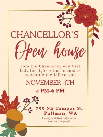 Chancellor Dave Cillay and First Lady Val Cillay invite you to the Ida Lou Anderson House for a celebration of the fall season! Stop by and enjoy some light refreshments and mingling with the WSU community.