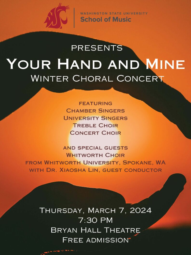 On March 7, 2024 at 7:30pm in Bryan Hall Theatre the WSU School of Music will present a choral concert entitled “Your Hand and Mine.” This concert is open to the public and free for all. Ensembles performing include: WSU Chamber Singers, WSU University Singers, WSU Treble Choir, and the WSU Concert Choir. They will also welcome the Whitworth Choir to WSU to perform a set of music and also to collaborate with the WSU Choirs for a collaborative performance of Kim André Arnesen’s “Flight Song” under the direction of Dr. Xiaosha Lin (Director of Choral Activities at Whitworth University.