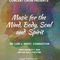 When do you turn to music: when you are happy, sad, angry, melancholy? Is it entertainment, background music, or does it provide focus, energy, or an opportunity to meditate and find your inner peace? The WSU Madrigal Singers and Concert Choir, under the direction of Dr. Lori Wiest explore these questions in Singing: Music for the Mind, Body, Spirit, and Soul.