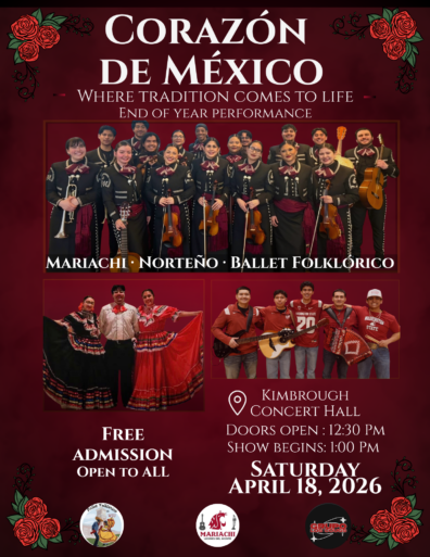 Join Mariachi Leones del Monte for Corazón de México, a live performance full of vibrant and uplifting Mexican music and dance. The show will feature mariachi, ballet folklórico, and special performances by Grupo Cougs, bringing together different styles that are meant to be felt and enjoyed.