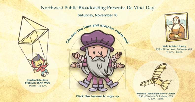 Join Northwest Public Broadcasting at the Jordan Schnitzer Museum of Art WSU for Da Vinci Day! From 9 a.m. – 12 p.m., children and families can enjoy activities at the museum that demonstrate connection between art and STEM—all free of charge. We’ll have art-making stations and other hands-on stations targeted toward K-3rd graders that connect to the current museum exhibitions. Children will all receive fun giveaways while supplies last. The best part? Children can also meet Xavier from the PBS KIDS show Xavier Riddle and the Secret Museum, who will be onsite that day for photos!