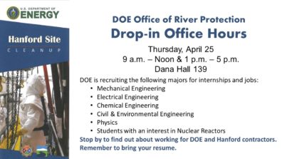 The DOE Office of River Protection, Hanford, invites students to drop-in April 25, 9 a.m. to 5 p.m., to learn about internship and job opportunities at Hanford. They are recruiting ME, EE, ChE, CE, and Physics majors, plus students interested in Nuclear Reactors. Remember to bring your resume.