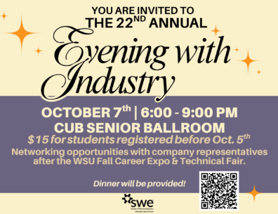 Join us for the 22nd Annual Evening with Industry, hosted by the Society of Women Engineers at Washington State University. This professional networking event takes place on October 7th from 6:00–9:00 PM in the CUB Senior Ballroom. Students will have the opportunity to connect directly with company representatives in a welcoming setting following the WSU Fall Career Expo & Technical Fair.