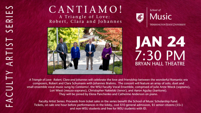 A Triangle of Love: Robert, Clara and Johannes will celebrate the love and friendship between the wonderful Romantic era composers, Robert and Clara Schumann with Johannes Brahms. As part of the WSU School of Music Faculty Artist series, the performance will occur on Friday, January 24, 2020 at 7:30 p.m. in Bryan Hall Theatre. The concert will feature an array of solo, duet and small ensemble vocal music sung by Cantiamo!, the WSU Faculty Vocal Ensemble, comprised of Julie Anne Wieck (soprano), Lori Wiest (mezzo-soprano), Christopher Nakielski (tenor), and Aaron Agulay (baritone). They will be joined by Elena Panchenko and Catherine Anderson on piano.