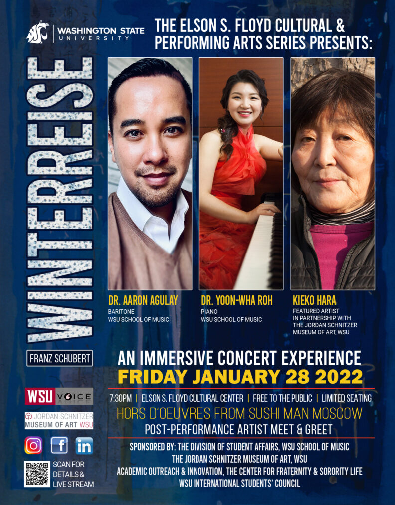 Made possible through collaboration between WSU’s Division of Student Affairs, School of Music, the Jordan Schnitzer Museum of Art, Center for Fraternity and Sorority Life, Academic Outreach and Innovation/Global Connections, and International Students’ Council, this immersive performance will feature WSU faculty Dr. Aaron Agulay (baritone), Dr. Yoon-Wha Roh (piano), and the artwork of Walla-Walla based artist Keiko Hara.