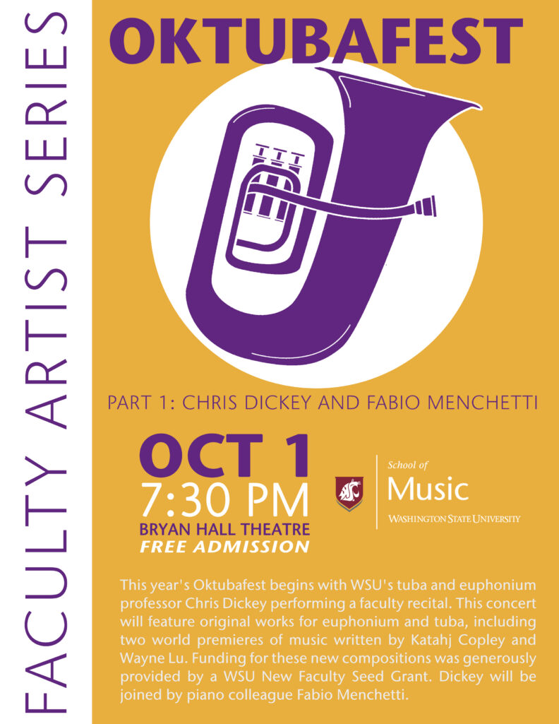 This year’s Oktubafest begins with WSU’s tuba and euphonium professor Chris Dickey performing a faculty recital. This concert will feature original works for euphonium and tuba, including two world premieres of music written by Katahj Copley and Wayne Lu. Funding for these new compositions was generously provided by a WSU New Faculty Seed Grant. Dickey will be joined by piano colleague Fabio Menchetti.
