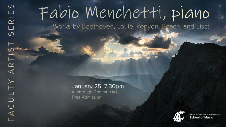 Performance Faculty Artist Series: Fabio Menchetti, piano Thursday, January 25, 2024 - add to calendar 7:30-9 pm Kimbrough Music Building This event will occur in Kimbrough Concert Hall. View location in Google Maps WATCH LIVE About the event PROGRAM Works by Beethoven, Louie, Kenyon, Beach, and Liszt. Contact Michelle White michellew@wsu.edu (509) 335-7696