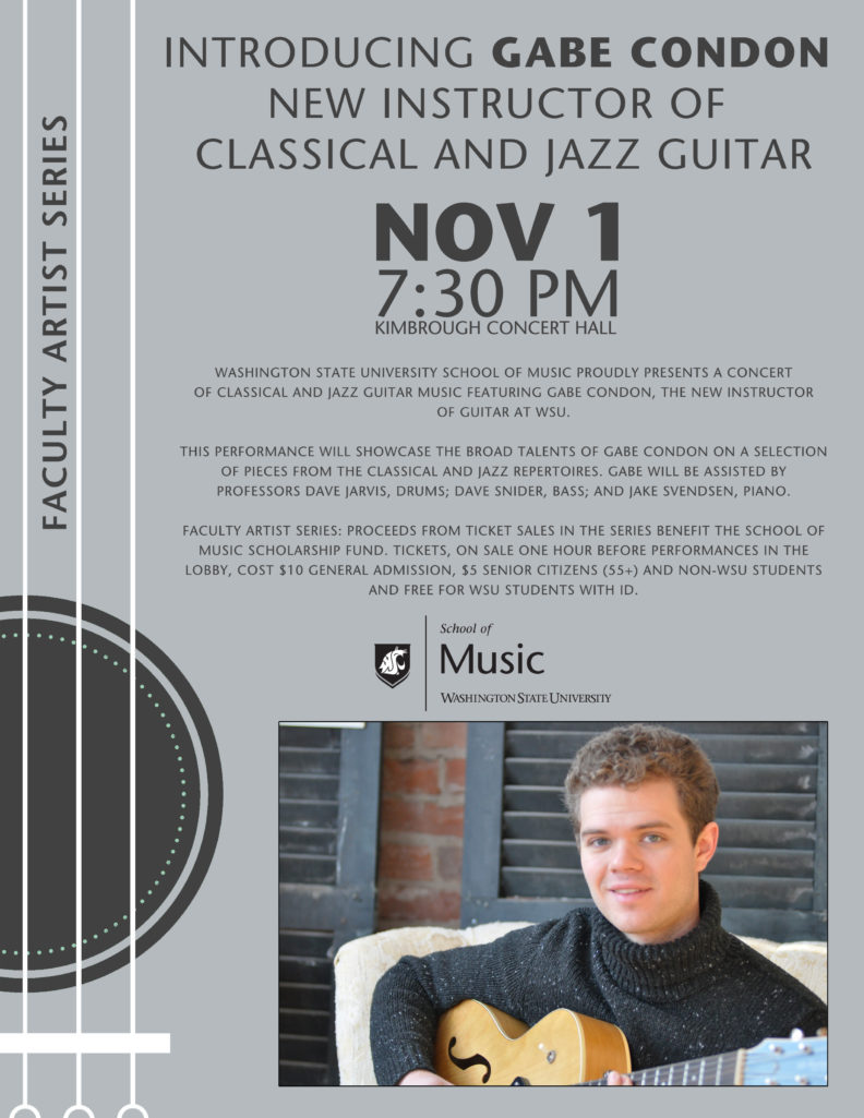 Washington State University School of Music proudly presents a concert of Classical and Jazz Guitar music featuring Gabe Condon, the new Instructor of Guitar at WSU.