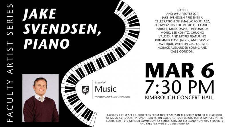 Pianist and WSU Professor Jake Svendsen presents a celebration of small-group jazz, showcasing the music of Charlie Parker, Miles Davis, Thelonious Monk, Lee Konitz, Chucho Valdes, and more! Featuring drummer Dave Jarvis, and bassist Dave Bjur, with special guests Horace Alexander Young and Gabe Condon.