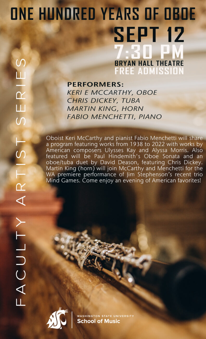 Oboist Keri McCarthy and pianist Fabio Menchetti will share a program featuring works from 1938 to 2022 with works by American composers Ulysses Kay and Alyssa Morris. Also featured will be Paul Hindemith’s Oboe Sonata and an oboe/tuba duet by David Deason, featuring Chris Dickey. Martin King (horn) will join McCarthy and Menchetti for the WA premiere performance of Jim Stephenson’s recent trio Mind Games. Come enjoy an evening of American favorites!