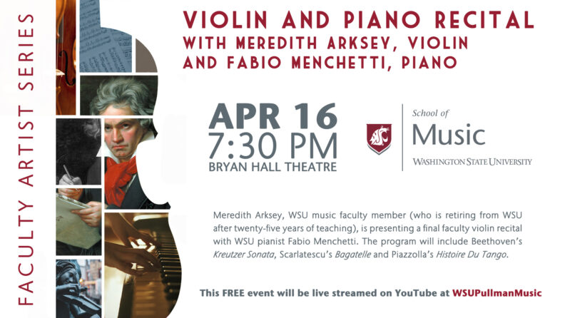 Meredith Arksey, WSU music faculty member (who is retiring from from WSU), is presenting a final faculty violin recital with WSU pianist Fabio Menchetti. The program will include Beethoven’s Kreutzer Sonata, Scarlatescu’s Bagatelle and Piazzolla’s Histoire Du Tango.