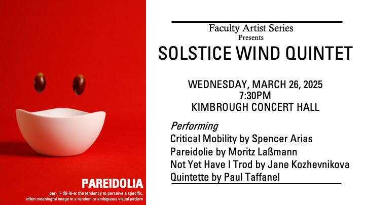 The Solstice Wind Quintet, comprised of WSU Sophia Tegart, flute, Keri E. McCarthy, oboe; Katie Rice, clarinet, Jacqueline Wilson, bassoon; Martin King, horn, will perform a recital of works for wind quintet. The recital will include Pareidolie by Moritz Laßmann, Not Yet Have I Trod There Jane Kozhevnikova, Critical Immobility by Spencer Arias, and Quintette by Paul Taffanel. The works include three relatively new works by living composers Laßmann, Kozahevnikova, and Arias along with the standard and beloved quintet by Belle Epoque Era composer Paul Taffanel.