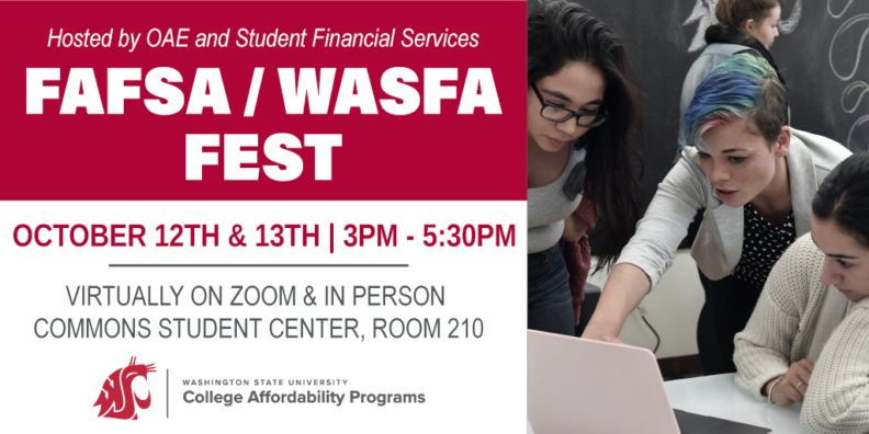 We are holding our annual FAFSA/WASFA Fest on October 12th and 13th, 2022. You can attend in-person or virtually from 3:00pm to 5:30pm.