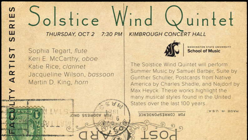 The Solstice Wind Quintet will perform Summer Music by Samuel Barber, Suite by Gunther Schuller, Postcards from Native America by Charles Shadle, and “Najdorf” by Max Heyck. These works highlight the many musical styles found in the United States over the last 100 years.