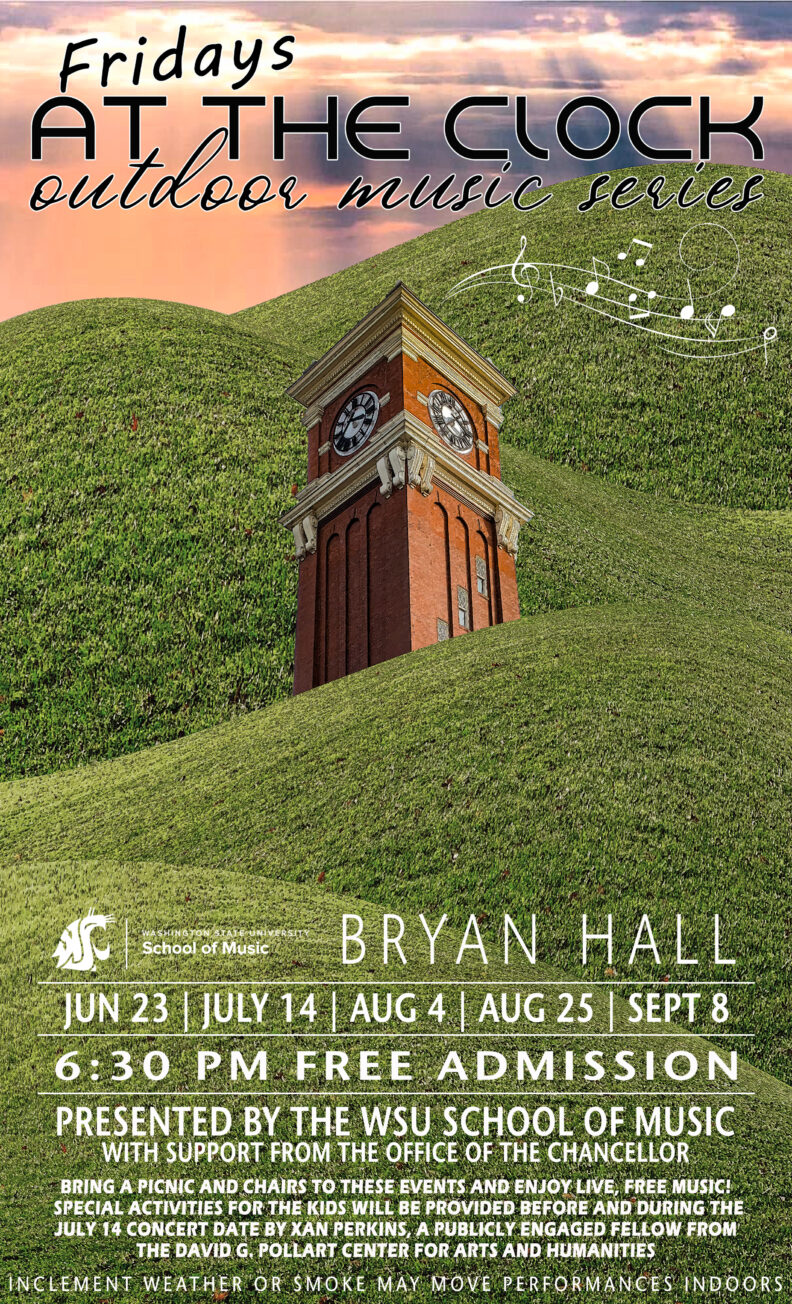 The WSU School of Music is thrilled to announce the third season of its summer music series – Fridays at the Clock! Located between Bryan Hall and Holland Library, the concerts will take place on Fridays at 6:30pm on the following dates: June 23, July 14, August 4, August 25, and an extra concert on September 8 for the big game weekend against Wisconsin! Bring your blankets and lawn chairs and enjoy family friendly concerts and our pleasant Palouse weather! Concerts will include performances by School of Music faculty and friends, as well as some fun music! There will be pre-concert activities provided by a David G. Pollart Center for the Arts and Humanities Publicly Engaged Fellow. Join us for these engaging evenings of musical entertainment!