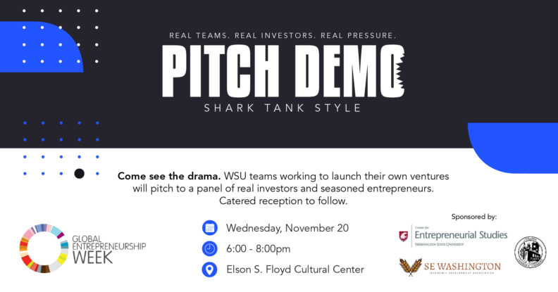 Come see the drama. WSU Center for Entrepreneurial Studies presents a Pitch Demo: Shark Tank Style for Global Entrepreneurship Week. WSU teams working to launch their own ventures will pitch to a panel of real investors and seasoned entrepreneurs. Catered reception to follow.