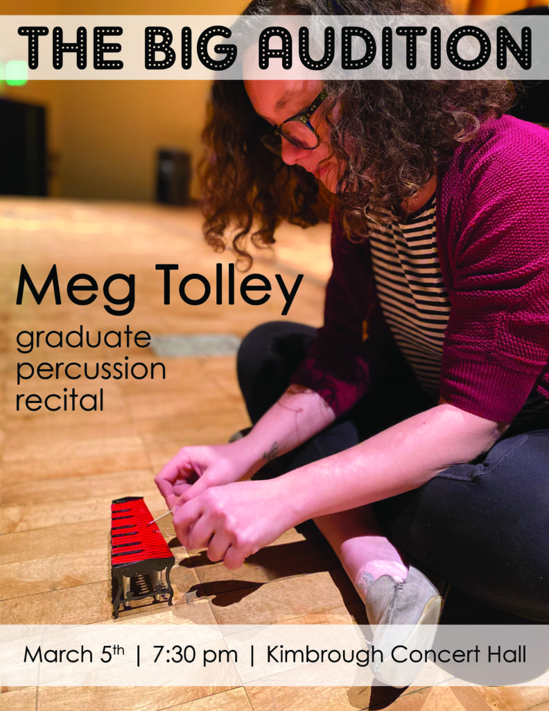 Performance Graduate Recital: Meg Tolley, percussion+ LIVESTREAM Thursday, March 5, 2020 - add to calendar 7:30-9:30 pm This event will occur in Kimbrough Concert Hall. WATCH LIVE! About the event CONCERT PROGRAM Contact Michelle White michellew@wsu.edu (509) 335-7696