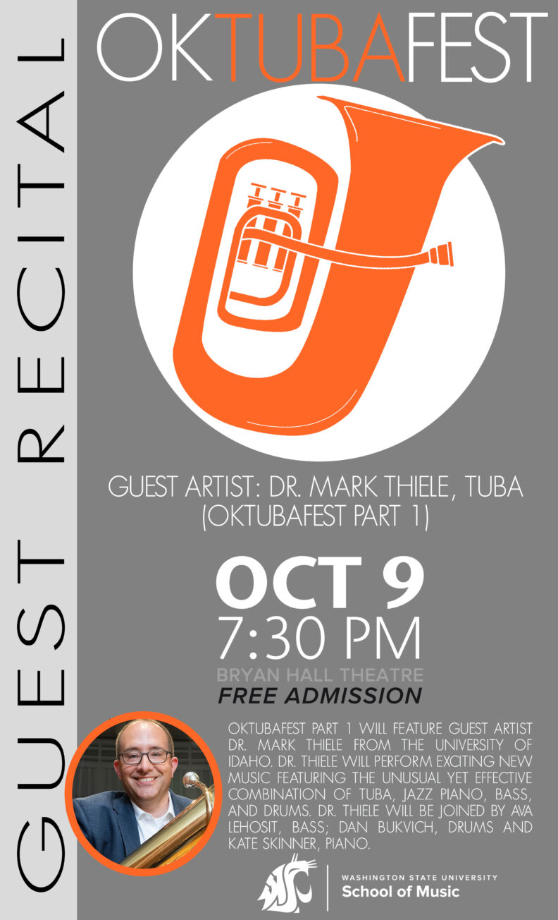Oktubafest Part 1 will feature guest artist Dr. Mark Thiele from the University of Idaho. Dr. Thiele will perform exciting new music featuring the unusual combination of tuba, jazz piano, and drums.
