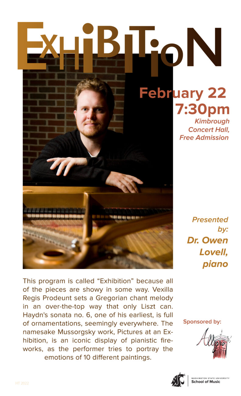 This program is called “Exhibition” because all of the pieces are showy in some way. Vexilla Regis Prodeunt sets a Gregorian chant melody in an over-the-top way that only Liszt can. Haydn’s sonata no. 6, one of his earliest, is full of ornamentations, seemingly everywhere. The namesake Mussorgsky work, Pictures at an Exhibition, is an iconic display of pianistic fireworks, as the performer tries to portray the emotions of 10 different paintings.