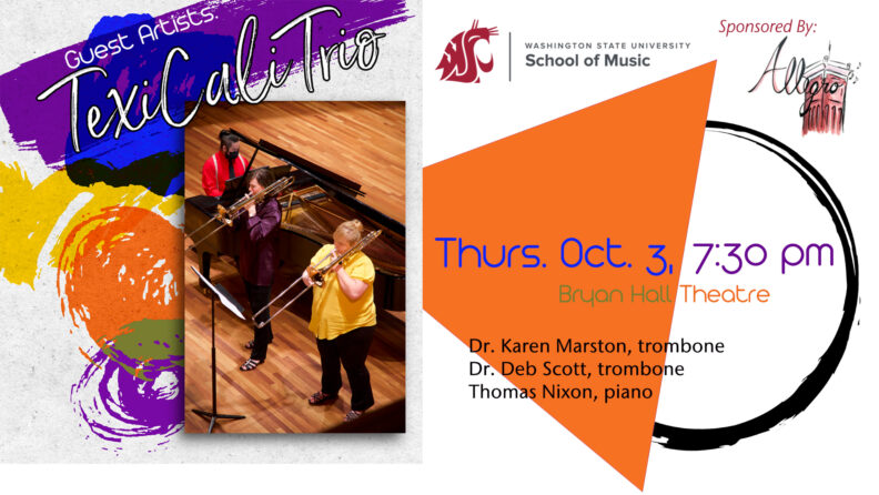 The TexiCali Trio is an ongoing collaboration between Dr. Karen Marston, Professor of Music at Mt San Antonio College (California) and Dr. Deb Scott, Professor of Trombone at Stephen F Austin State University (Texas). The group is a natural extension of the long standing friendship between Deb and Karen, who met on a gig in Houston, Texas, in 1999. Knowing at that time that were the only two professional female trombonists in the area, they formed a close bond, which has endured many years and many miles. TexiCali was officially named in 2021, after Deb and Karen had already formed a habit of sharing recitals and working together on commissions of new music. Since that time, TexiCali has performed at the International Trombone Festival and the International Womens Brass Conference, and has given recitals at numerous universities. In 2021, together with pianist Dr. Jason Lo, TexiCali commissioned and premiered Justin Writer’s Spectrums, for two trombones and piano.
