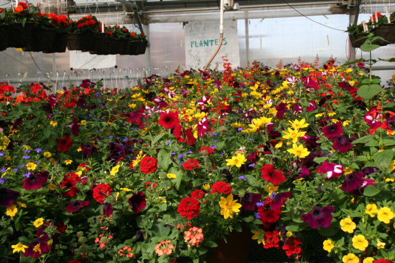 12″ pulp hanging baskets: fuchsias, begonias, and wave petunias at 36.50 ea