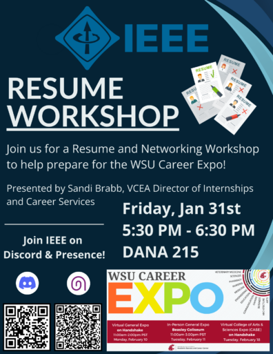 Join IEEE for a resume and networking workshop to help prepare for the WSU Spring 2025 Career Expo.