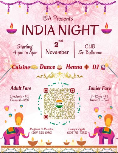 Reception / Open House India Night Saturday, November 2, 2024 - add to calendar 4-8:30 pm Compton Union Building Sr. Ballroom View location in Google Maps India Night About the event Contact Indian Students Association laasya.vajjala@wsu.edu (509) 715-7285