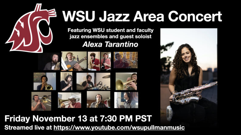 Jazz Area Concert Friday, November 13, 2020 - add to calendar 7:30-9 pm This event will be live streamed on YouTube at WSUPullmanMusic WATCH LIVE About the event PROGRAM Contact Michelle White michellew@wsu.edu (509) 335-7696