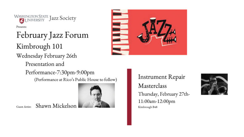 Performance Jazz Forum Wednesday, February 26, 2020 - add to calendar 7:30-9:30 pm This event will occur in Kimbrough 101 Contact Michelle White michellew@wsu.edu (509) 335-7696