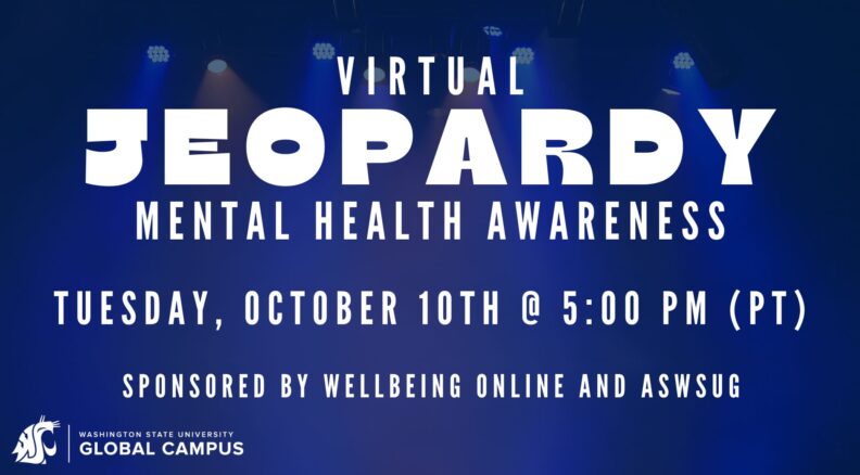 Join us for a fun game night. We’ll be playing Virtual Jeopardy on Zoom with a mental health theme. While we compete for awesome prizes, learn helpful information about improving your personal wellbeing and your overall success at WSU. All Cougs are welcome to join (from any of the 6 campuses) as we play games and learn from WSU’s Wellbeing Online. Sponsored by the Associated Students of Washington State University Global (ASWSUG).