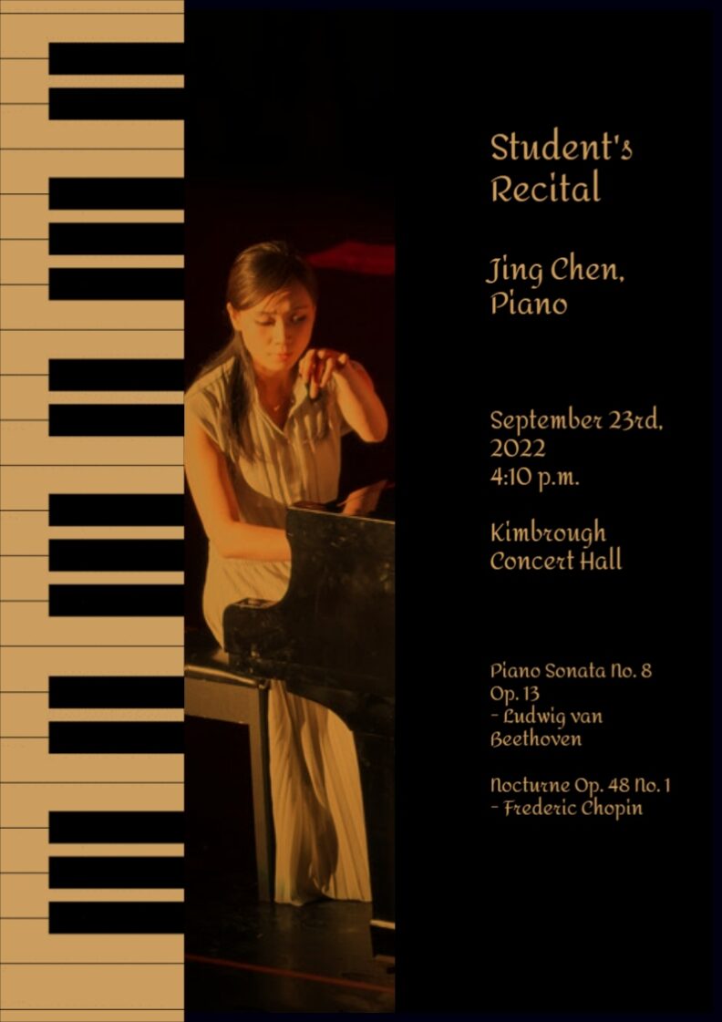 Student Recital: Jing Chen, piano Friday, September 23, 2022 - add to calendar 4:10-5 pm This event will occur in Kimbrough Concert Hall. Watch Live! About the event PROGRAM Contact Michelle White michellew@wsu.edu (509) 335-7696