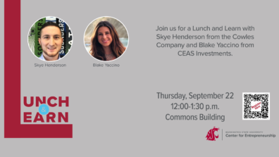 Finance students interested in wealth management and entrepreneurship students interested in raising capital join us for a Lunch and Learn with Skye Henderson from the Cowles Company and Blake Yaccino from CEAS Investments.
