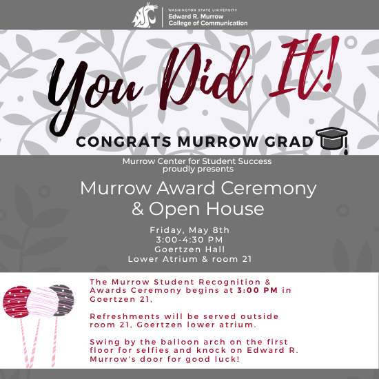 Join fellow Murrow Cougs, staff, and faculty on Friday, May 8th as Dean Pinkleton kicks off the Murrow Student Recognition and Awards Ceremony at 3:00 PM in Goertzen 21, welcoming Murrow’s newest alumni…you and the graduating class of 2026! Families and supporters are welcome to join! Light refreshments will be served during this special occasion, celebrating your achievements.