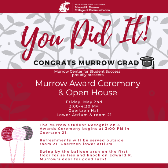 Join fellow Murrow Cougs, staff, and faculty on Friday, May 2nd as Dean Pinkleton kicks off the Murrow Student Recognition & Awards Ceremony at 3:00 PM in Goertzen 21, welcoming Murrow’s newest alumni…you and the graduating class of 2025! Families and supporters are welcome to join! Light refreshments will be served during this special occasion, celebrating your achievements.