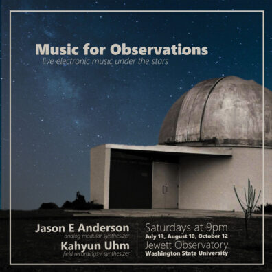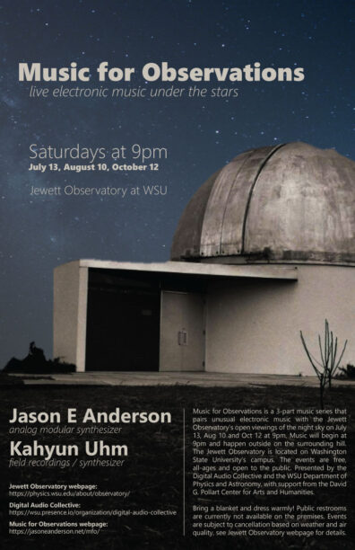 Music for Observations is a 3-part music series that pairs unusual electronic music with the Jewett Observatory’s open viewings of the night sky on July 13, August 10 and September 7 October 12 at 9pm. Music will happen outside on the surrounding hill. The events are free, all-ages and open to the public. Presented by the Digital Audio Collective and the WSU Department of Physics and Astronomy, with support from the David G. Pollart Center for Arts and Humanities.