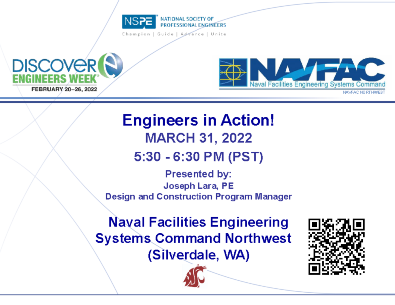 Grab your dinner and join us online through Zoom to learn about jobs in the Naval Facilities Engineering Systems Command (NAVFAC) Pacific Northwest.