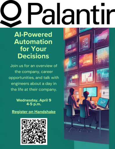 Palantir Technologies is where data meets innovation! As a cutting-edge tech company at the forefront of AI and analytics, Palantir is making big moves in *high-growth industries*. If you’re looking for a place where you can work on real-world problems, push boundaries, and be part of the future of tech, this is it. Market ups and downs won’t slow us down—we’re here to disrupt, build, and innovate. Ready to make an impact, join us on April 9th at 4 p.m. for a virtual meet and greet with our recruiters and the Palantir Team.