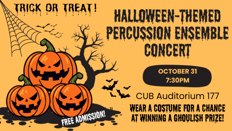 For a fun Halloween treat, the percussion ensemble is presenting an evening of ghoulish, fun music for trick-or-treaters of all ages! Costumes are encouraged – wear your best Halloween costume for a change to win a prize! The concert will held in the Compton Union Building’s (CUB) Auditorium 177 at 7:30pm and is FREE!