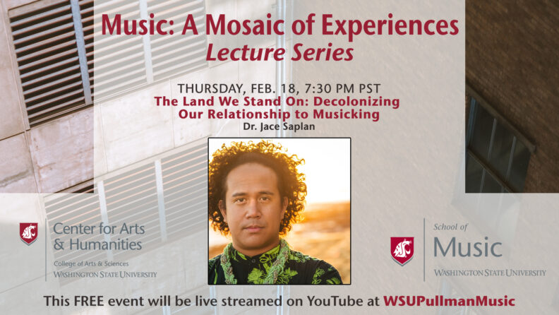 The WSU School of Music and the Center for Arts and Humanities welcomes Dr. Jace Saplan to present his lecture “The Land We Stand On: Decolonizing Our Relationship to Musicking.” This talk is part of the School of Music lecture series “Music: A Mosaic of Experiences.” In music, there are stories. In music, there are sonic lineages. In performing/composing/studying/teaching/ these soundworlds, we communicate their ancestral joy, trials, tribulations, and trauma. What, then, is our reverent responsibility in our study and teaching of music? Join Dr. Saplan as we consider how our ways of knowing can leave room for music(s) outside of our identities, how our musical relationships can affirm BIPOC and LGTBQIA+ experiences, and how our musical lives can root within spaces of radical community.