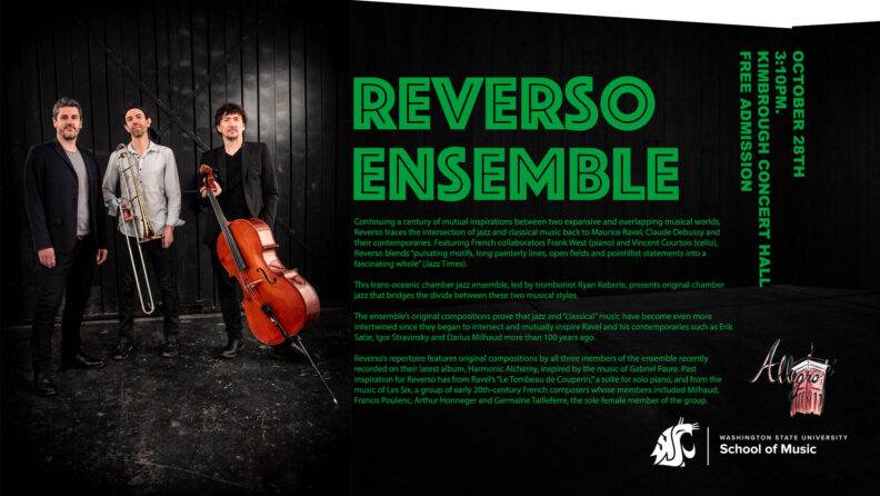 Reverso’s repertoire features original compositions by all three members of the ensemble recently recorded on their latest album, Harmonic Alchemy, inspired by the music of Gabriel Faure. Past inspiration for Reverso has from Ravel’s “Le Tombeau de Couperin,” a suite for solo piano, and from the music of Les Six, a group of early 20th-century French composers whose members included Milhaud, Francis Poulenc, Arthur Honneger and Germaine Tailleferre, the sole female member of the group.