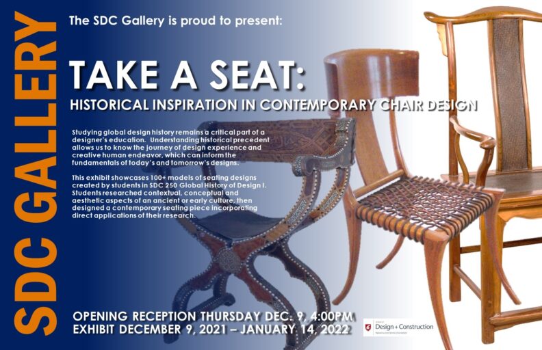 Please join us for a QUICK opening celebration of our next SDC Gallery Exhibition: “TAKE A SEAT: HISTORICAL INSPIRATION IN CONTEMPORARY CHAIR DESIGN”