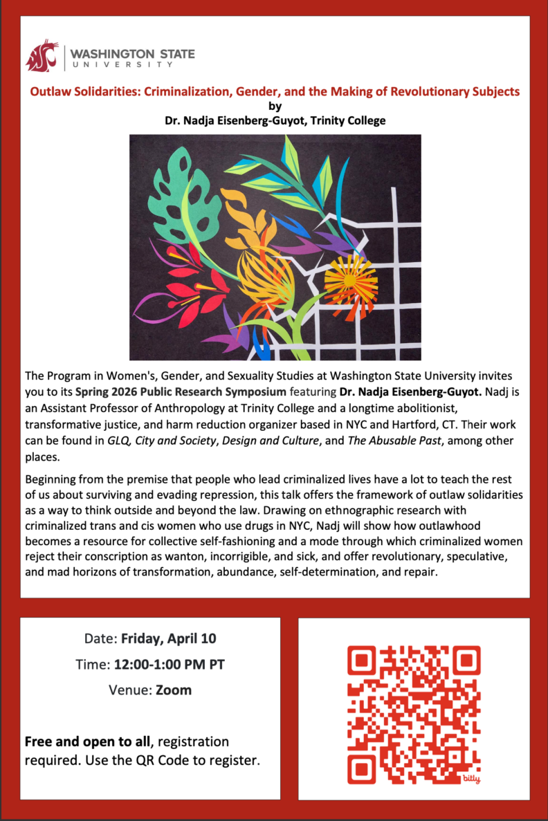 The Program in Women’s, Gender, and Sexuality Studies (WGSS) at Washington State University invites you to its Spring 2026 Public Research Symposium featuring Dr. Nadja Eisenberg-Guyot. Nadj is an Assistant Professor of Anthropology at Trinity College and a longtime abolitionist, transformative justice, and harm reduction organizer based in NYC and Hartford, CT. Their work can be found in GLQ, City and Society, Design and Culture, and The Abusable Past, among other places.
