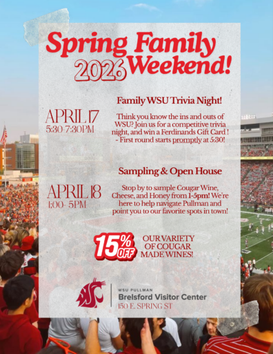 On Saturday, April 18th from 1:00–5:00 PM, stop by for our Sampling & Open House. Enjoy a relaxed afternoon sampling Cougar-made wine, cheese, and honey while exploring the Visitor Center. Our team will be available to help you navigate Pullman and share favorite local spots, making it the perfect opportunity to get insider tips during your visit. Guests can also take advantage of a 15% discount on a variety of Cougar-made wines all weekend!